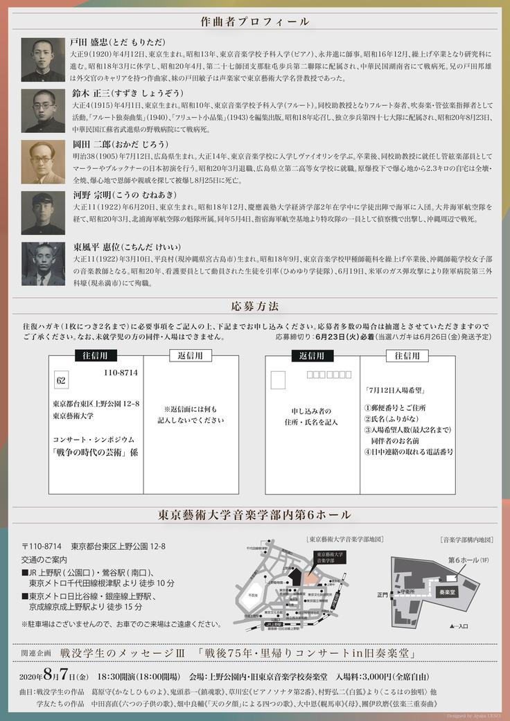 戦争の影響は当然のことながら、こと学生に対してだけでなく、その時代の人々にあまねく及んでおり、戦争が原因で命を落とした音楽家は少なくありません。最近の大学史史料室の調査によって、東京音楽学校の学生だけでなく、教師・卒業生の戦没者も次第に明らかになってきており、そうした成果を発表するコンサート・シンポジウムが開催されます。戦没学生のメッセージ・プロジェクトの関連企画ともいえるこのコンサート・シンポジウムに、ご興味がございましたら是非お出かけください。