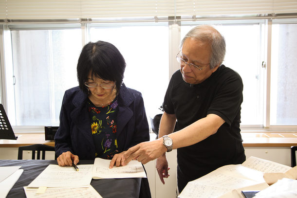 今日は今回のプロジェクトで、重要な役割を果たしているキーマンの一人をご紹介します。それは作曲科の小鍛冶邦隆先生です。戦没学生の譜面は、必ずしも清書されたものばかりではなく、本人の書き直しや指導教員のアドバイスが加わえられて、どう演奏すればいいのか判断に迷うものも少なくありません。小鍛冶先生には、そうした書き込みについて音楽的にもっとも合理的な解釈を施してもらい、演奏用楽譜を作成する作業をお手伝いいただいています。