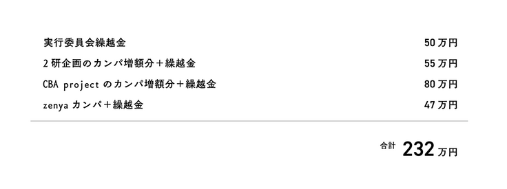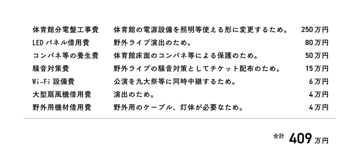 今回の増額分の費用について、改修工事によって被る学生の負担を大学側にもいくらかの費用を出して援助していただけないかとお伺いしましたが、例年学祭費用として拠出している以上のものを出すことは難しいとの回答をいただきました。そのため、この学生のみで負担しきれない金額177万円を本クラウドファンディングの目標金額とし、現在集まった金額を差し引いて目標金額を50万円とさせていただきます。