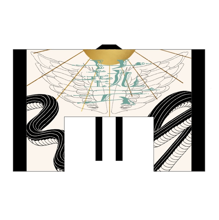 厳格さ、神格さを意識してデザインした。閻魔大王の裁判官らのための儀式服であり、威厳を放ちながらも舞をおどれば華麗に魔く姿に注目してほしい。