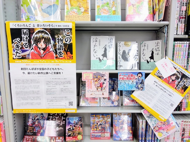 店長さんに、「寺田浩晃さんの漫画本を劇団たんぽぽで舞台化するプロジェクトが立ち上がっているんです。」というお話をさせていただき、そのためのクラウドファンディングを今行っていること、そして寺田浩晃さんの「くろいりんごときいろいそら」という素晴らしい作品を、演劇を通してこどもたちに広げていけないか、という思いがあることお伝えさせていただきました。