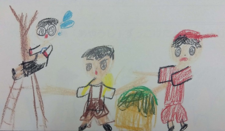 ▼こちらの絵は、海のシーンを描いてくれました。また、感想文の中に「ハチベエくんとモーちゃんとハカセは自分で生きようとしていてすごかった」という言葉があり、その言葉にとても大きな喜びを感じました。海で遭難したり、無人島についてしまったり、色んな災難がある三人組ですがそれぞれが、楽しんだり悲しんだり怒ったり一生懸命生きようとしている、そんな姿がこどもたちに伝わっていれば良いなと思いながら稽古をしていましたので本当に嬉しかったです。