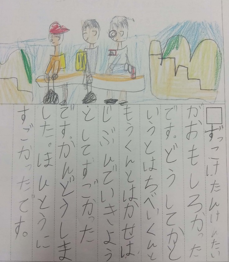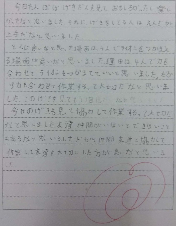 ▼良いなと思った場面を丁寧に書いてくれてとても嬉しいです。この場面から「力を合わせて作業するって大切だ」と思ってくれたことや、「仲間がいないとできないこともある」「友達を大切にしたい」など、大人の私たちがはっ!と思わせられるような感想を書いてくれました。大人になったわたしたちは、こういう大切な事がどんどんどんどん「当たり前」になってしまって相手への感謝や、物事への感謝が薄れてしまうことも。こんな時、こういう大切なことをこどもたちから改めて気付かされることがあります。