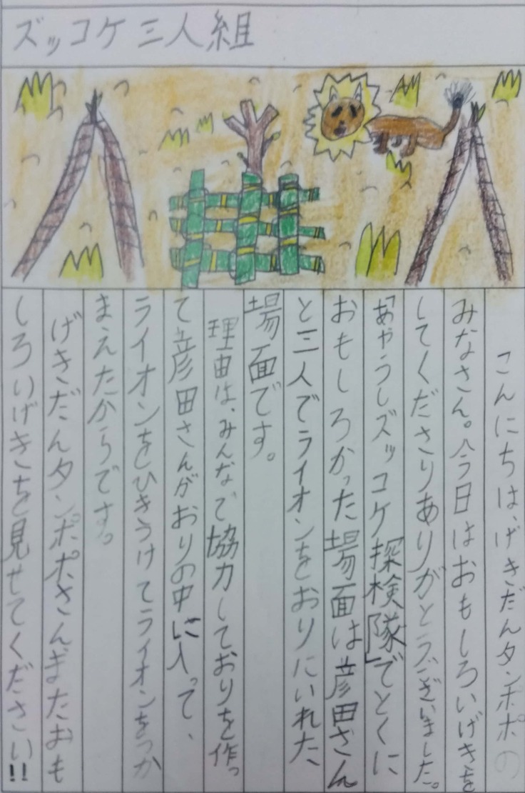 さて、本日は今年の6月に「あやうし!ズッコケ探険隊」を公演させていただいた浜松市立雄踏小学校の児童の皆様からいただいた劇の感想文を一部ご紹介させていただきます。また、浜松市立雄踏小学校の先生方、児童の皆様、感想文を載せさせていただくことを快く承諾してくださり本当にありがとうございました。こどもたちが一生懸命書いてくれた、描いてくれた、感想文や絵をぜひ皆様ご覧ください!