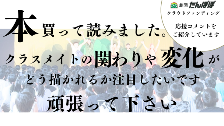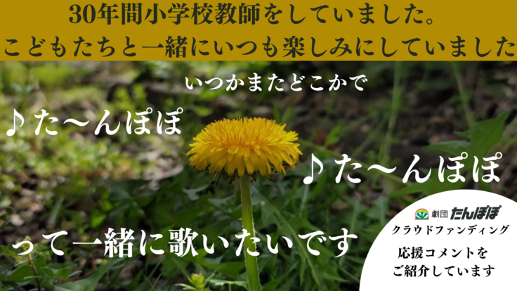 皆さん、こんにちは!劇団たんぽぽです。クラウドファンディングページをご覧の皆様いつもありがとうございます。今回は前回に引き続き第2弾で、これまで皆様から頂いた応援メッセージの中から一部コメントをご紹介させていただきます。