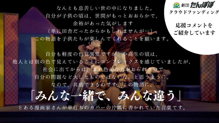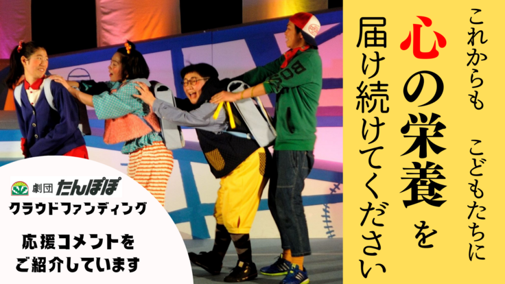 皆さん、こんにちは!劇団たんぽぽです。クラウドファンディングページをご覧の皆様いつもありがとうございます。今回は前回に引き続き第3弾で、これまで皆様から頂いた応援メッセージの中から一部コメントをご紹介させていただきます。