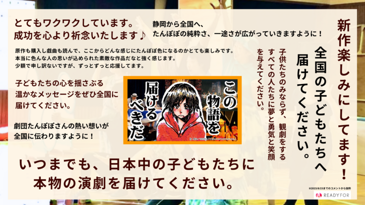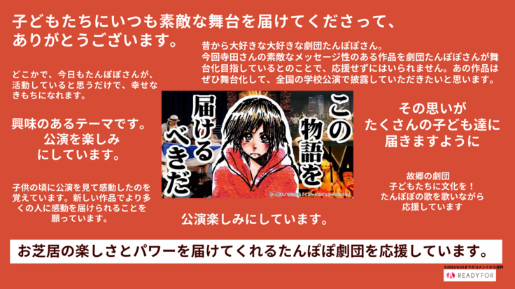 私たちの想いにご賛同くださり、力強いご支援、応援をいただけたこと、心より感謝申し上げます。まだ、紹介しきれていない応援コメントを一部ではありますが、まとめました。