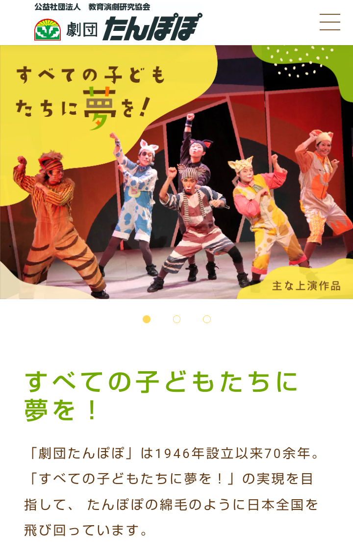 さて、本日ですが、皆様、すでにお気づきの方もいらっしゃるかもしれませんが劇団たんぽぽのホームページがリニューアルいたしました!公演やイベント情報、上演作品のラインナップなど劇団たんぽぽの様々な情報をこのホームページで観ていただけます。今回のホームページリニューアルで変わったことといえば、デザインはもちろんのこと、スマートフォンでも見やすいホームページになりました。今までの良い部分はそのままに(「たんぽぽのあゆみ」など劇団たんぽぽ77年の歴史や創設者「小百合葉子」についてのページがご覧いただけます)、快適に皆様がホームページを観ていただけるよう、会議を重ねてきました。皆様、新しくなったホームページ、是非のぞいてみてくださいね。リンクはこちらから▼