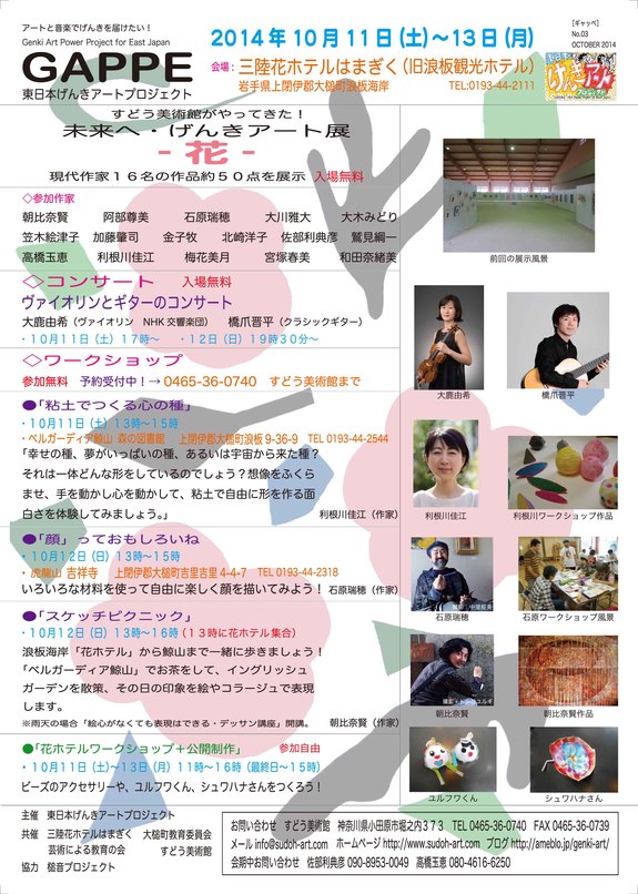 このチラシを、大槌町全戸の仮設住宅、山田町も生涯学習課を通して町民の方々に配らせていただきます。今日は、GAPPEメンバーですどう美術館に集い、現地の協力者へ配送作業を行います。その様子は、しっかり写真に収めて、明日、ご報告させていただきます!
