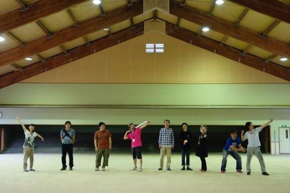 (昨年展覧会場、大槌町寺内弓道場。メンバーと一緒に弓を射るポーズのはず…)