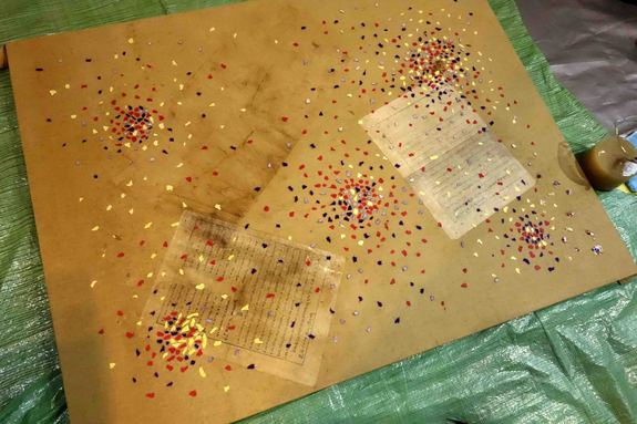 今回は、その作業中に思いついてしまいました!せっかく「にかわ」が接着剤なので、思いつきで「和紙」をキャンバスに貼り付けてしまいました!色のついたところはちぎり絵風にしています。たのしい〜!これからどうなっていくのか、ワクワクドキドキです。ちなみに、完成イメージはまだ全然ありません。遊びながら、楽しみながら『自分の花』を創りあげていきたいと思います。