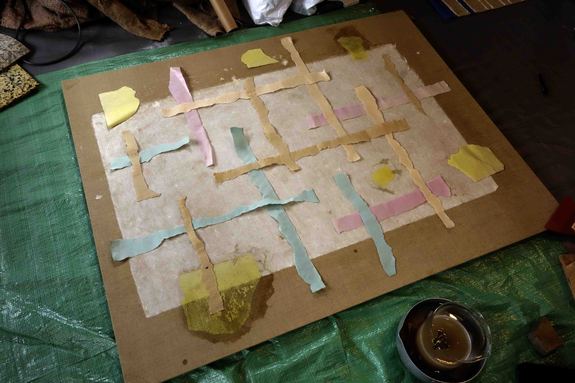 全然ちがいます。和紙の接着が乾いたら、今度は、石膏の粉末をにかわで溶いた下地材をこの上から塗っていきます。和紙は隠れてしまいますが、下地材が油を吸うと半透明になり、下の和紙が顔を出すのです!