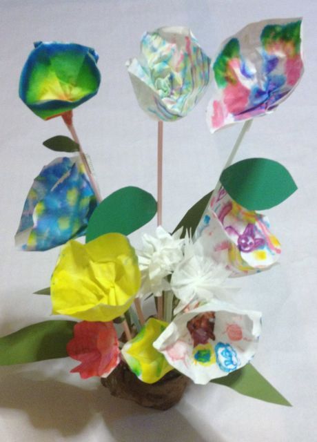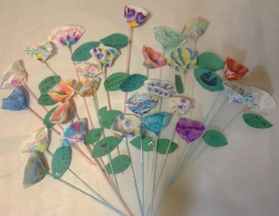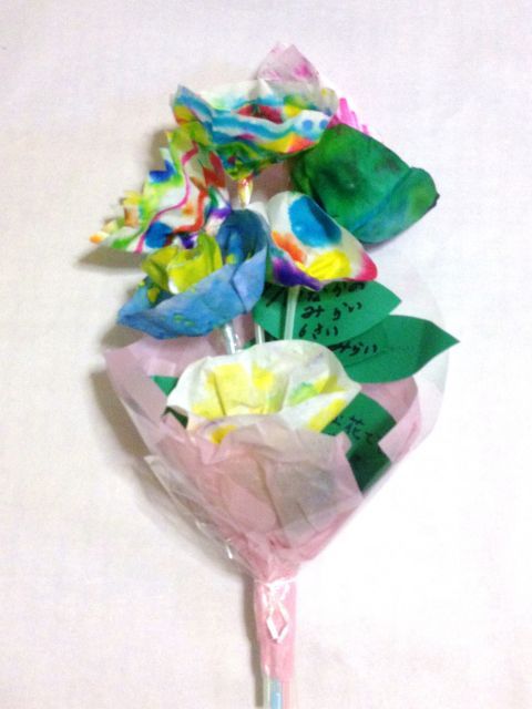 このことばに答えて、子どもたちは心をこめてたくさんの『花』をつくってくれました!写真の子はライライ君。小2の元気男子です。