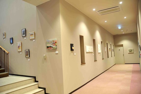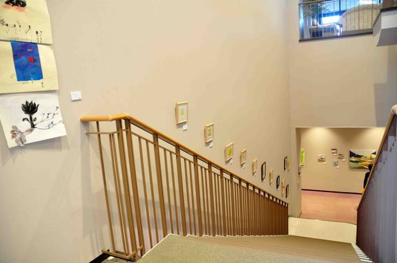 階段のリズムに合わせて素敵な展示。廊下に続きます。