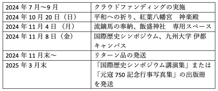 元寇750年を迎える2024年は、過去の歴史的な出来事から学び、考え、平和な未来を目指す機会と捉えています。 このプロジェクトで「国際歴史シンポジウム」、「平和への祈り」、「流鏑馬の奉納」の3つのイベントを企画しております。みなさまのご協力やご支援によって記念プロジェクトをより大きく、より意義深いものにしたいと考えております。記念プロジェクト実現するため、みなさまのご寄付とご協力をお願い申し上げます。