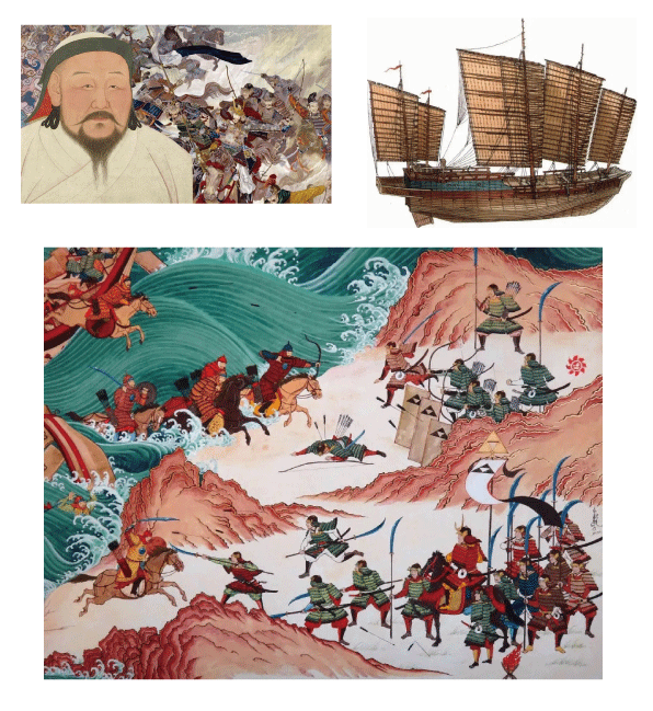 元寇(蒙古襲来)は、日本の鎌倉時代中期の1274年・1281年に、モンゴル帝国(元朝)および属国の高麗によって2度にわたり行われた日本侵攻である。元寇の前には、フビライハン(元朝皇帝)が日本に5度にわたり使節団を送り、属国になるように求めていました。2度の侵略の時に、侵攻の時に暴風がおこり、モンゴル帝国による日本への侵攻は失敗に終わりました。この暴風のことを神風と呼ばれています。