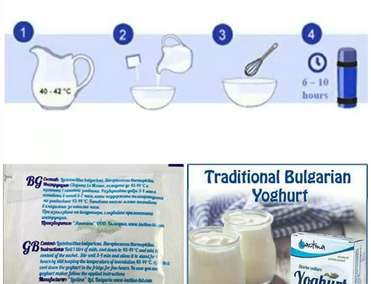 スターターの内容:凍結乾燥バラの葉、自家製ブルガリアヨーグルトの調製のために特別に選択された多重株ラクトバチルスブルガリクス及びストレプトコッカスサーモフィラス。1箱あたり1グラム10袋がふくまれています。1グラムの各小袋は1L牛乳用です。