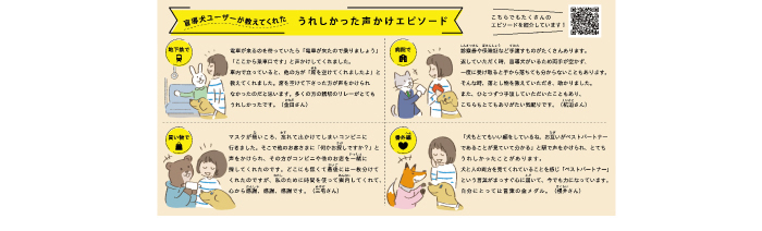 盲導犬ユーザーが実際に体験した、うれしかった声かけエピソードを紹介しています。具体的なエピソードで「こんな時に困ることがあるのか!」と実感していただけます。