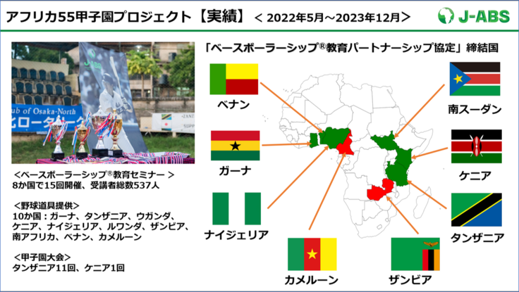 アフリカの学校に、日本型野球指導法「ベースボーラーシップⓇ教育」を紹介、普及していくプロジェクトです。アフリカ55の国・地域に25年かけて展開していきます。2024年7月現在、アフリカ8カ国の野球連盟と協定を締結しました。2日14時間かけて行うべースボーラーシップⓇ教育セミナーは、アフリカの指導者対象に、これまで8か国で15回開催し、受講者総数は537人。受講者の75%が100%かそれ以上に満足した結果となっています。
