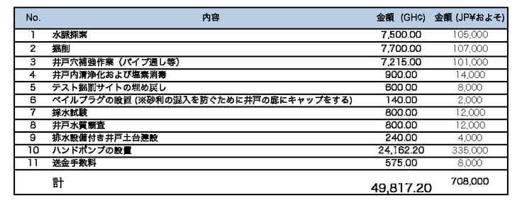 手押し式の井戸を建設します。見積書を入手し井戸建設では、およそ70万円の費用が必要です。このうち30万円をクラウドファンディングによって集めます (手数料・為替変動を考慮し目標金額は45万円に設定しています) 。もし、井戸の建設費を上回ってご寄付いただいた場合は、超過分を現地住民の社会インフラ改善(電気・通信等)のために使用することとします。