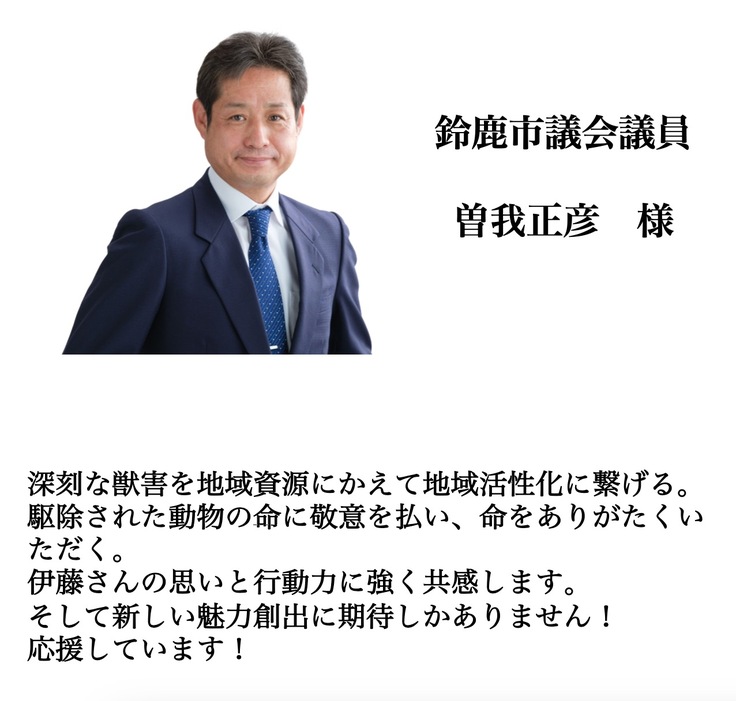 メッセージを戴いたのは、鈴鹿市議会議員の曽我正彦様です。