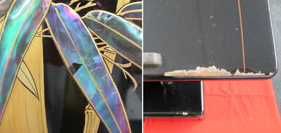 (表螺鈿破損部/天板漆塗破損部分)