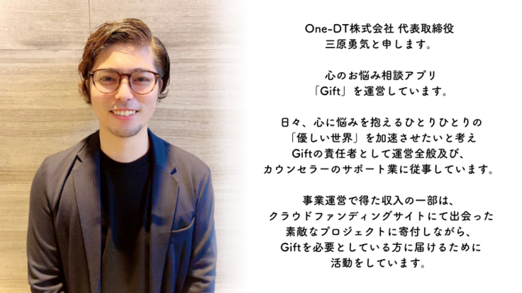 飲食業界から転職しIT業界へチャレンジ。心のお悩み相談アプリ「Gift」を運営しています。 日々、心に悩みを抱えるひとりひとりの「優しい世界」を加速させたいと考え、Giftの責任者として運営全般及び、カウンセラーの採用・育成・サポート業に従事。 事業はまだまだ小さいものの、事業運営で得た収入の一部を、クラウドファンディングサイトにて出会った素敵なプロジェクトに寄付しながら、Giftを必要としている方に届けるために活動しています。