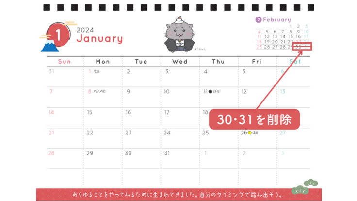 ↓ 1月:右上2月の「30・31日」を削除