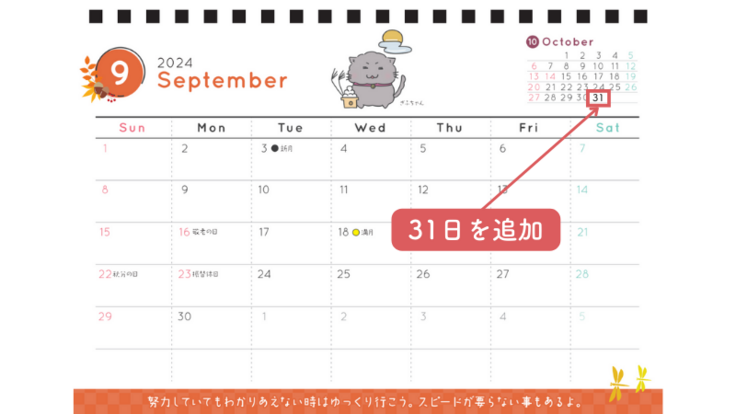 ↓9月:右上10月に「31日」を追加