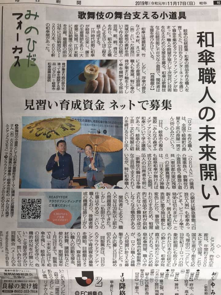 今朝の毎日新聞朝刊に、先日のおとなの夜学の様子と、傘ロクロ、傘骨の危機、そして見習いの育成とクラウドファンディングについてバッチリ掲載いただきました!(しかもクラウドファンディングQRコードまで!)