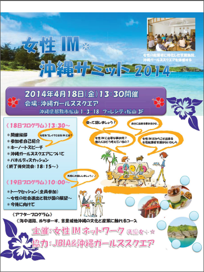 JBIA―IM「女性IMネットワーク」 発起人 森下ことみさんが中心となり活動する全国各地の女性IMのみなさんが、いよいよ来週、4月18日(金)~19日(土)に沖縄ガールズスクエアに視察勉強会へお越しになります。