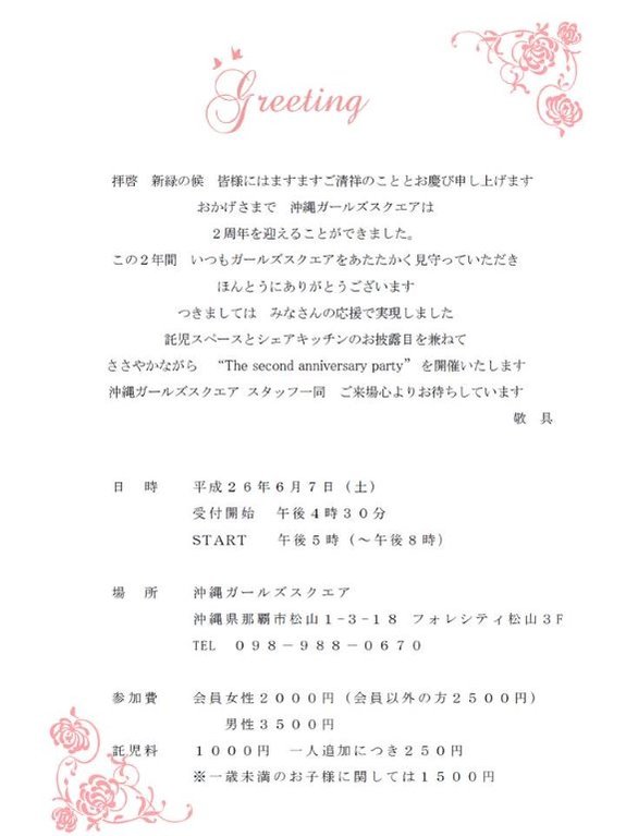 参加お申込み:info@girls-okinawa.jp 宛に、タイトル「2周年パーティ参加」として、