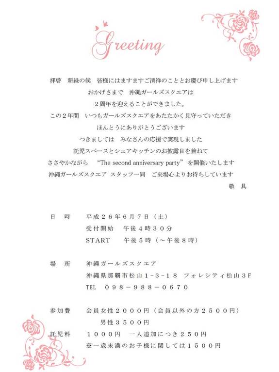 参加お申込み:info@girls-okinawa.jp 宛に、タイトル「2周年パーティ参加」として、