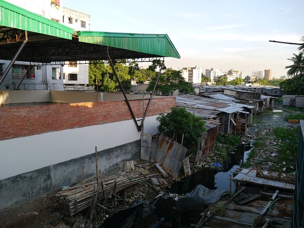 写真の右側にあるのが低所得者層居住区です。トタン屋根の家々がところせましと並んでいます。左側の壁の向こうには6階から8階建てのマンションが立ち並んでいます。