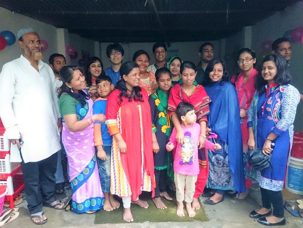 写真一番左の男性は、ショバンバーグの地域運営委員会(Area Management Committee)のリーダーです。前列の女性たちはパートナー団体Phulki(フルキ)の職員です。後列左側にはシャプラニールの現ダッカ事務所長の菅原(青いシャツの男性)、その左隣には同じくダッカ事務所職員のマフザ(家事使用人の少女たち支援事業担当)が映っています。