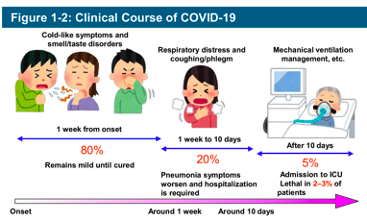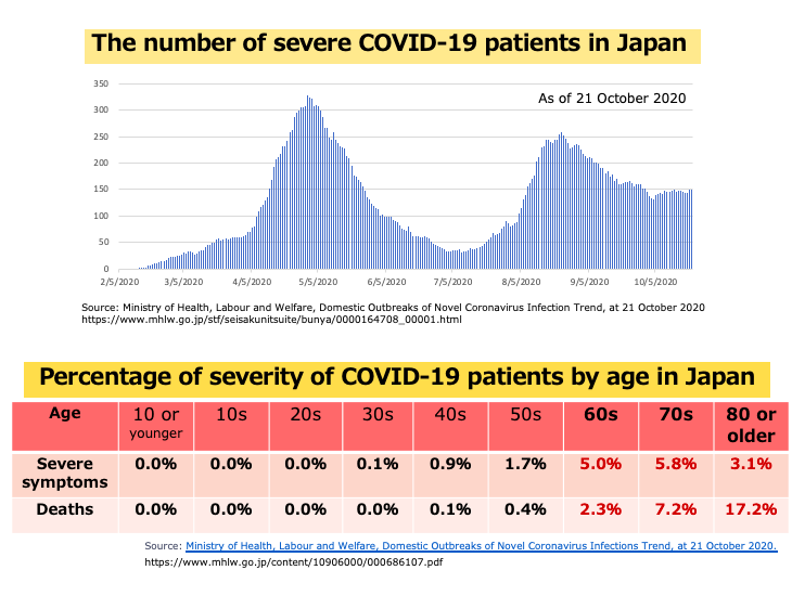 ✔︎ About 5% of all COVID-19 patients become seriously ill after 10 days or more of becoming infected and require mechanical ventilation. 1,786 of those severe COVID-19 patients have died in Japan (Source: Ministry of Health, Labour and Welfare at 4 November 2020).