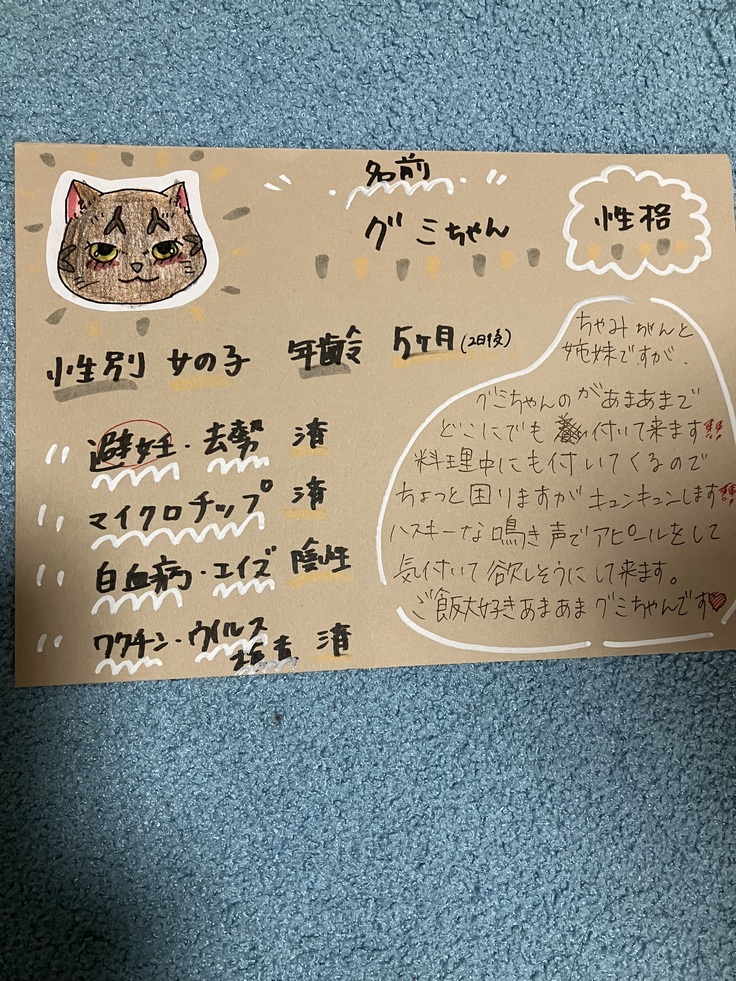 グミは7月の20日に1歳の誕生日を迎え成猫になったばかり、うちにきてまだ1年も経ってないです。まだまだグミといろんな事をして、おいしいものを食べてグミらしく楽しく過ごしてほしいです。1歳でグミの人生を終わりになんてしたくないです。みなさんのお力を貸して下さい。よろしくお願致します。