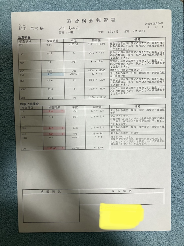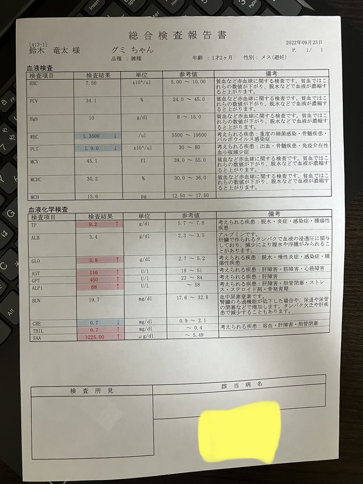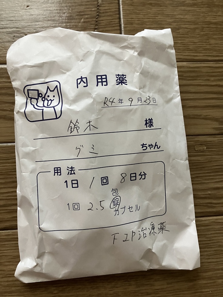 その日は血液検査と解熱剤を打ってもらったのですが、原因がわからず、また1週間後に検査をしてもらうことになり、抗生物質と肝臓の数値を下げる薬を処方してもらい帰宅しました。熱は下がり、元気になったのですが血液検査の数値が下がらず、通院し、毎日薬を飲むことに、、、。