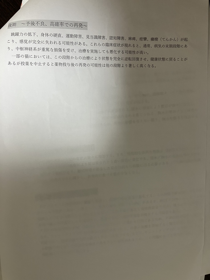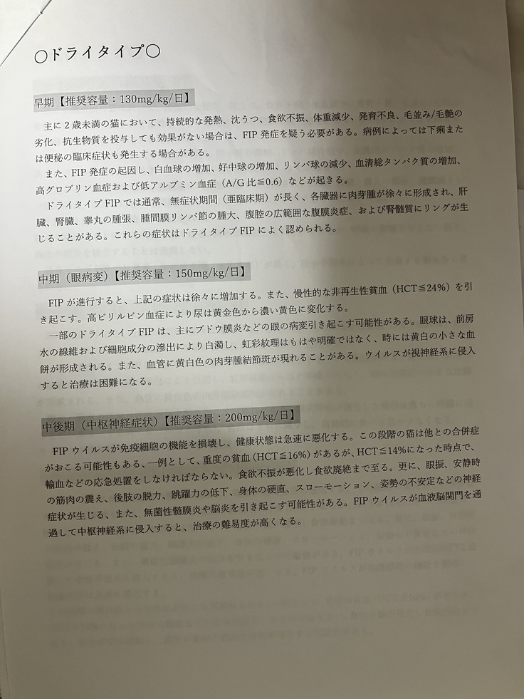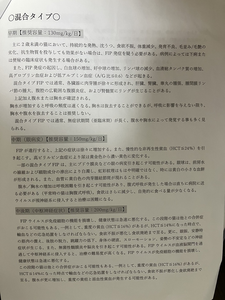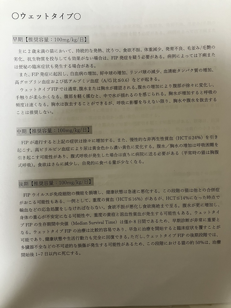 その病院では、インターフェロンとステロイドを使った延命的治療しかできないことを聞かされ、絶望的な気持ちで帰宅しました。現在の日本では、FIPの有効な治療法はないということになります。