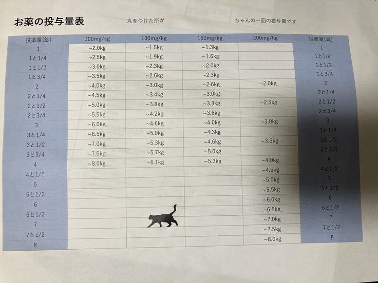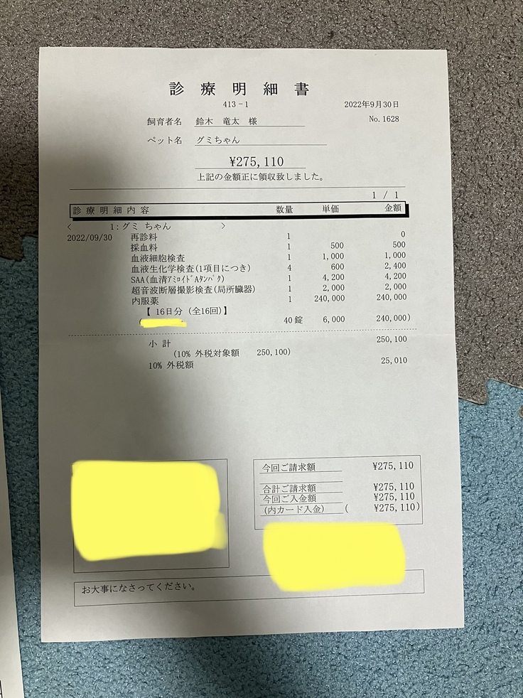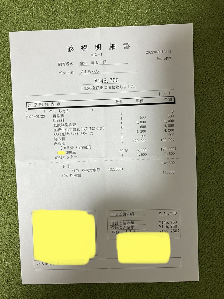 今の時点では、体重3.8kgの猫は1日2.5粒となっており薬代だけで1万5千円/日、10万5千円/週となっており、84日間すべて飲ませるためには薬代だけで126万円かかる見込みであり、今後の体重の増加に伴っても投薬量が増量するため、さらにかかる見込みであります。それに加えて血液検査や通院費を合わせると、150万円ほどかかると考えております。