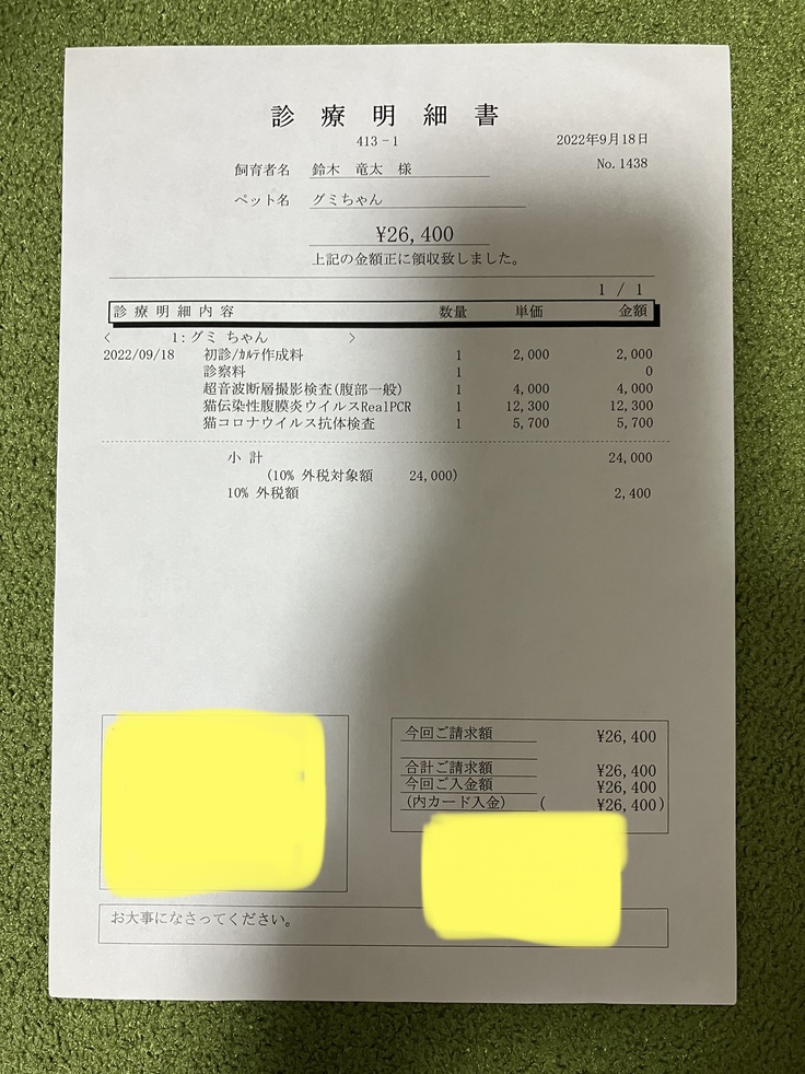さらに調べると、積極的にFIPの治療してくれる病院をいくつか見つけたので、行くことにしました。その病院でまた血液検査、エコー、PCR検査をしてもらうとやはりFIPの可能性が高いと診断されました。