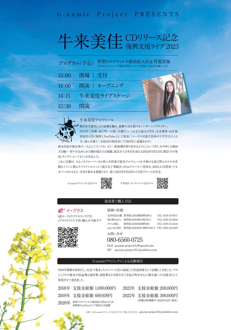 G-namieプロジェクトのプレゼンツ企画として「牛来美佳CDリリース記念 復興支援ライブ」を開催いたします。 東日本大震災、原発事故により福島県浪江町から群馬県へ避難したシンガーソングライター牛来美佳の活動を周知すると共に、震災を風化させず、大切な想いをを共有し合い、未来へ繋いでいくコンセプトを主旨に毎年開催しております。今回はプレゼンツ企画ですが、これまで同様、収益費から諸経費・運営費の一部を除き全て浪江町を中心に被災地への支援金として使用いたします。 【会場・設営費用…100万円、企画演出費・広報委託費等…50万円、パネル展示等の制作費用…20万円、その他雑費等…30万円】