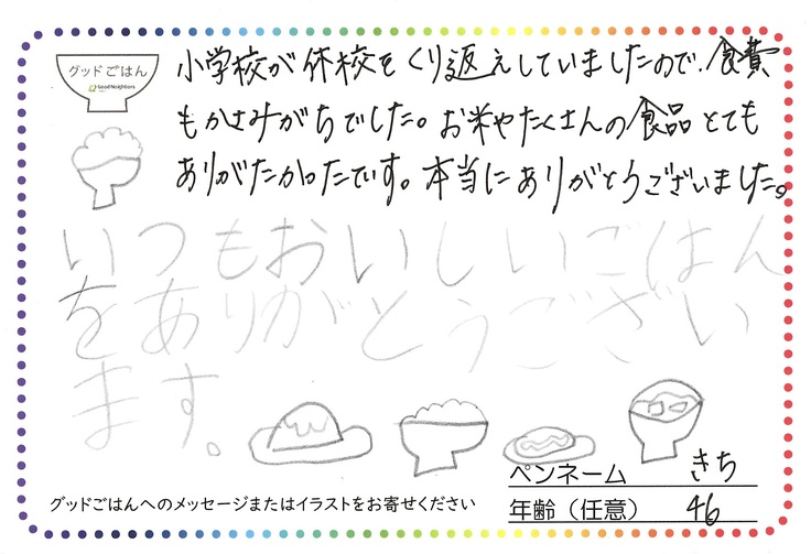 「グッドごはん」の食品支援を受けた利用者の方々の声をご紹介します。