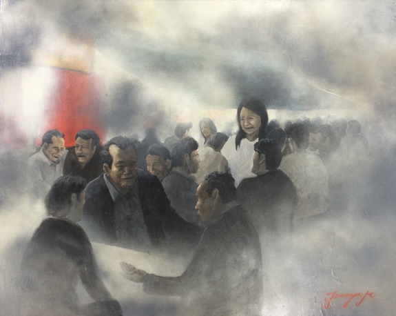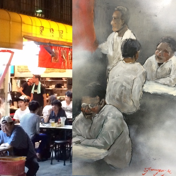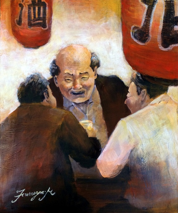 至福の時間に訪れる酒場の光景と酔っ払い達は必ずしも美しい姿ではないかもしれませんが素直な姿に愛おしさを感じます。そしてそれらは私の制作コンセプトである「人の思いの在りか」に繋がると考えています。
