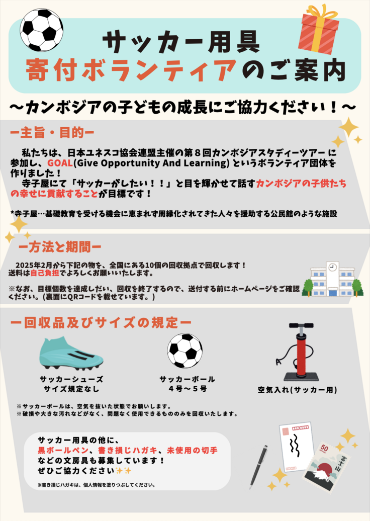サッカー用具、文房具、書き損じハガキなどの寄付ご希望の方は下のリンクから!!↓