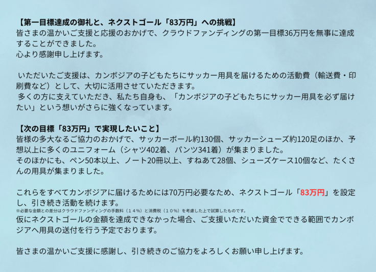 などを集められています。 しかし、これらをカンボジアへ送るには多額の費用が掛かるため、現在寄付を募っております。100人分のサッカー用具をカンボジアに送るために、まずは36万円を目標金額として設定させていただいております。