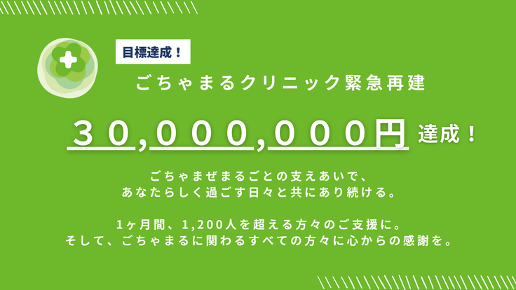 「ごちゃまるクリニック緊急再建」クラウドファンディングは、このたび1,200人を超える皆様の温かいご支援をいただき、目標金額30,000,000円を無事に達成することができました。