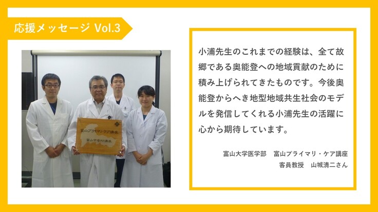 富山大学医学部富山プライマリ・ケア講座客員教授山城清二さんより応援メッセージをいただきました!