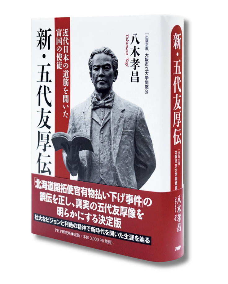 しかし、大阪市立大学同窓会では、五代は開拓使官有物払い下げ事件において無実であると考えられていました。そこで同窓会は市立大学「開学の祖」の汚名をすすぐべく、文学博士の八木孝昌先生に真相の調査と史実に基づいた伝記の執筆を依頼し、調査の結果、五代の無実が明らかになりました。そして2020年に「新・五代友厚伝」が発刊され、これまで歴史の定説とされてきた五代への官有物払い下げ説が根本的に間違っていることが豊富な資料と分析をもって論証されました。これは五代友厚名誉回復運動における大きな功績でした。