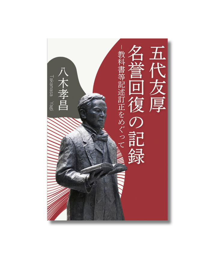 さて今回、八木先生の新たな本がたる出版より出版されます。『五代友厚名誉回復の記録』(以下、今回の本)と題され、五代友厚名誉回復のための活動の記録、つまり、教科書が書きかえられ、真実が世に広まっていった過程を書き残した本です。本にして残さなければ、なぜ教科書記述が訂正されたのか、そこにどのようないきさつがあったのかは、いずれ誰にもわからなくなってしまいます。